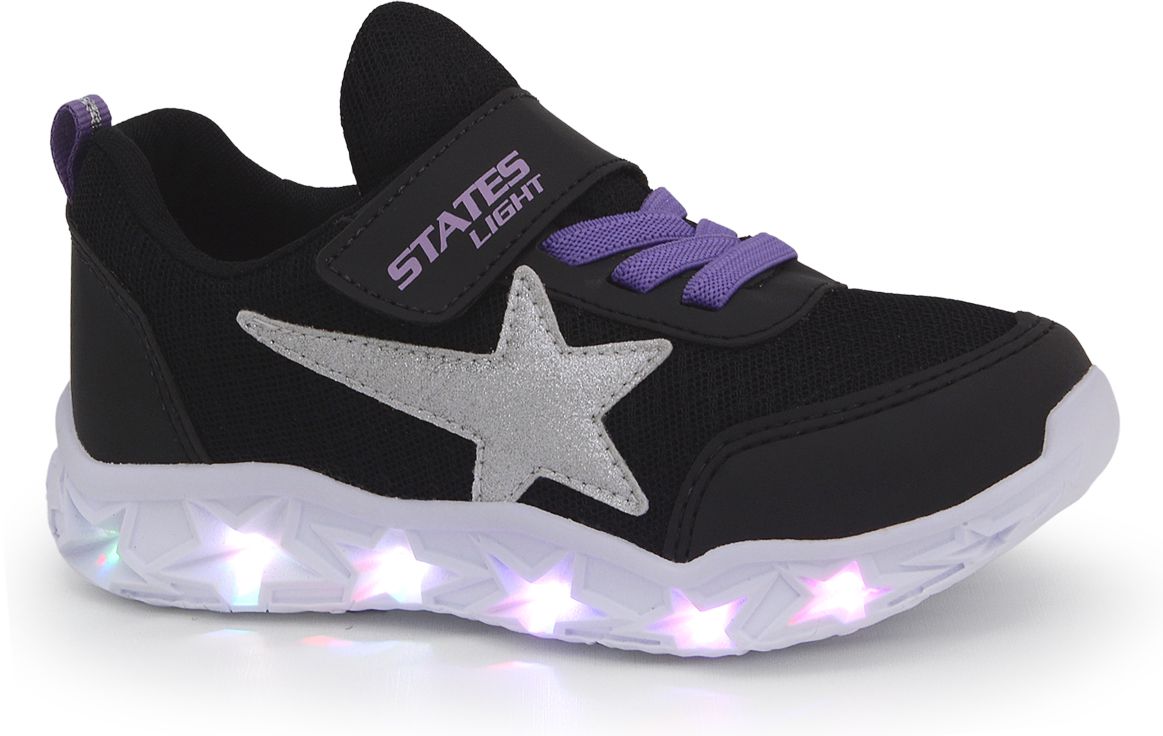 Tênis States Light com leds de longa duração que acendem com impacto. Possui detalhe lateral em glitter, fechamento em velcro e elástico que facilitam o calce, forro em material têxtil que permite a transpiração dos pés. O solado é produzido em microexpandido, material leve e macio.